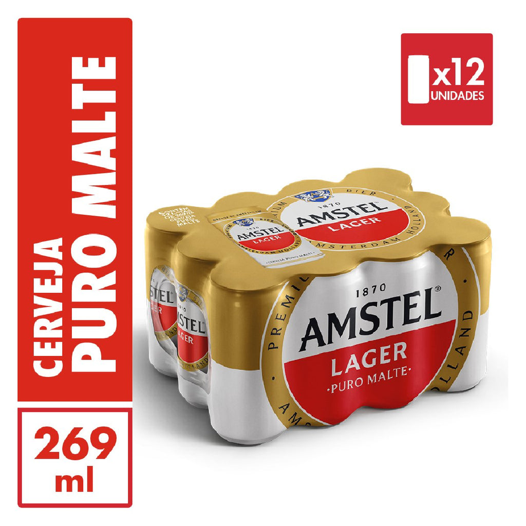 Pack com 12 latas de cerveja Amstel Lager, cada uma com 269 ml. Cerveja do estilo lager com sabor leve e refrescante, apresentando coloração dourada clara, aroma suave de malte e lúpulo, e paladar equilibrado com final limpo. Ideal para consumo gelada em encontros, festas ou refeições variadas. Teor alcoólico em torno de 4,7 % por lata.