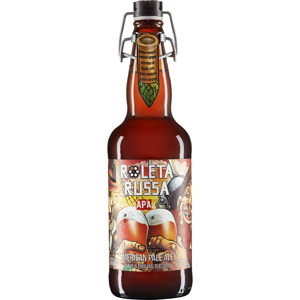 Cerveja Roleta Russa American Pale Ale 500ml. Inflem as velas, recolham a âncora e descubram novos sabores. Um misterioso navio inglês, com destino a Índia, se perdeu nos temidos mares do sul e acabou sendo atacado por piratas Americanos! Os piratas nem imaginavam, mas nesse navio haviam saborosas cervejas do estilo Pale Ale. Fascinados por essa novidade, incorporaram extrema carga de lúpulo na sua American Pale Ale, uma cerveja que era mais leve, fazendo dela agora o seu tesouro. As cervejas ganharam um Duplo Dry Hopping, ousado como todo pirata, proporcionando aquele tiro de aroma ao abrir a garrafa. VENDA PROIBIDA PARA MENOR DE 18 ANOS,