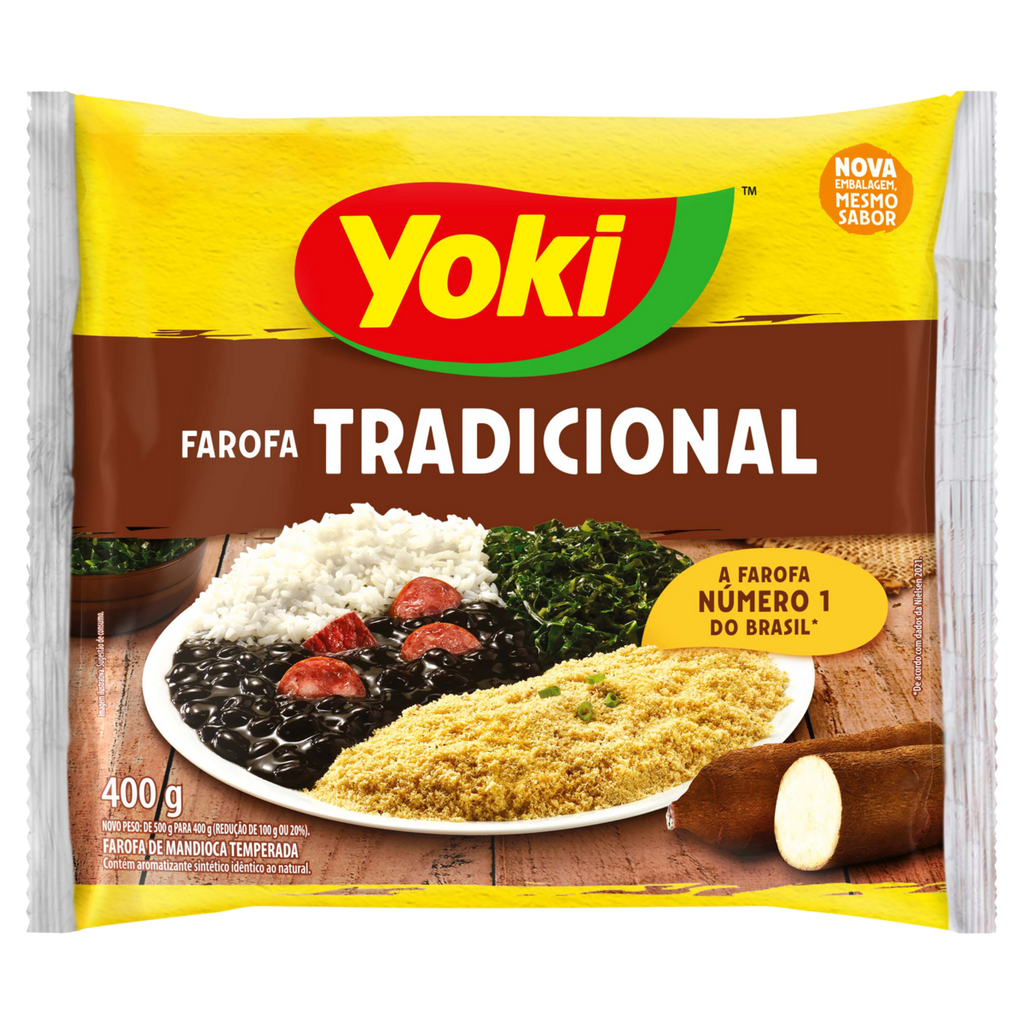 A Farofa de Mandioca Tradicional Yoki é perfeita para destacar o sabor dos outros alimentos e completar as refeições, acompanhando diversos pratos, do churrasco à feijoada. Crocante, a farofa de mandioca pronta é muito prática, mas pode receber outros temperos para se adequar ainda mais ao gosto do consumidor. Além da farofa sabor tradicional, conheça os demais produtos da linha Yoki. "1. Pronta para ser consumida 2. Já vem temperada 3. Alimento alternativo para dietas sem glúten 4. É energética e antioxidante 5. À base de mandioca, é rica em nutrientes 6. Textura sequinha e crocante " "¿ A Farofa de Mandioca Tradicional Yoki é versátil e prática, perfeita para quem deseja uma boa alimentação, mas precisa de rapidez no preparo. ¿ Temperada com sal, alho, cebolinha verde, entre outros ingredientes. ¿ Farofa Yoki é a no 1 em vendas no Brasil. " "A Yoki foi fundada na década de 80, fazendo parte do Grupo General Mills, uma das maiores empresas alimentícias do mundo. Tendo como objetivo proporcionar conveniência e segurança na venda de alimentos no Brasil, seus produtos (como farinha de mandioca, pipoca e batata palha) figuram entre os campeões de vendas em suas categorias, estando presentes em 90% dos lares de nosso país. Temos grande satisfação em fazer parte de grandes momentos da vida de nossos consumidores, por isso, trabalhamos diariamente para aprimorar nossos serviços e produtos.